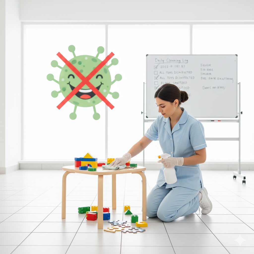 玩具・マット・手すりなどは、定期的にアルコール除菌を行いましょう。